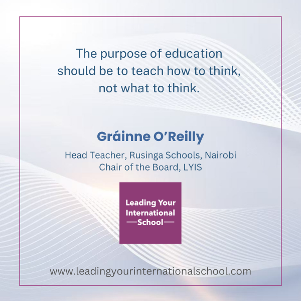 Grรกinne OโReilly is the Global Head of Leadership Consultancy at Leading Your International School, bringing over four decades of educational experience to her role. She is an expert in navigating the challenges of international leadership, having been a startup specialist involved in 13 new schools throughout her 32 years of Headship.